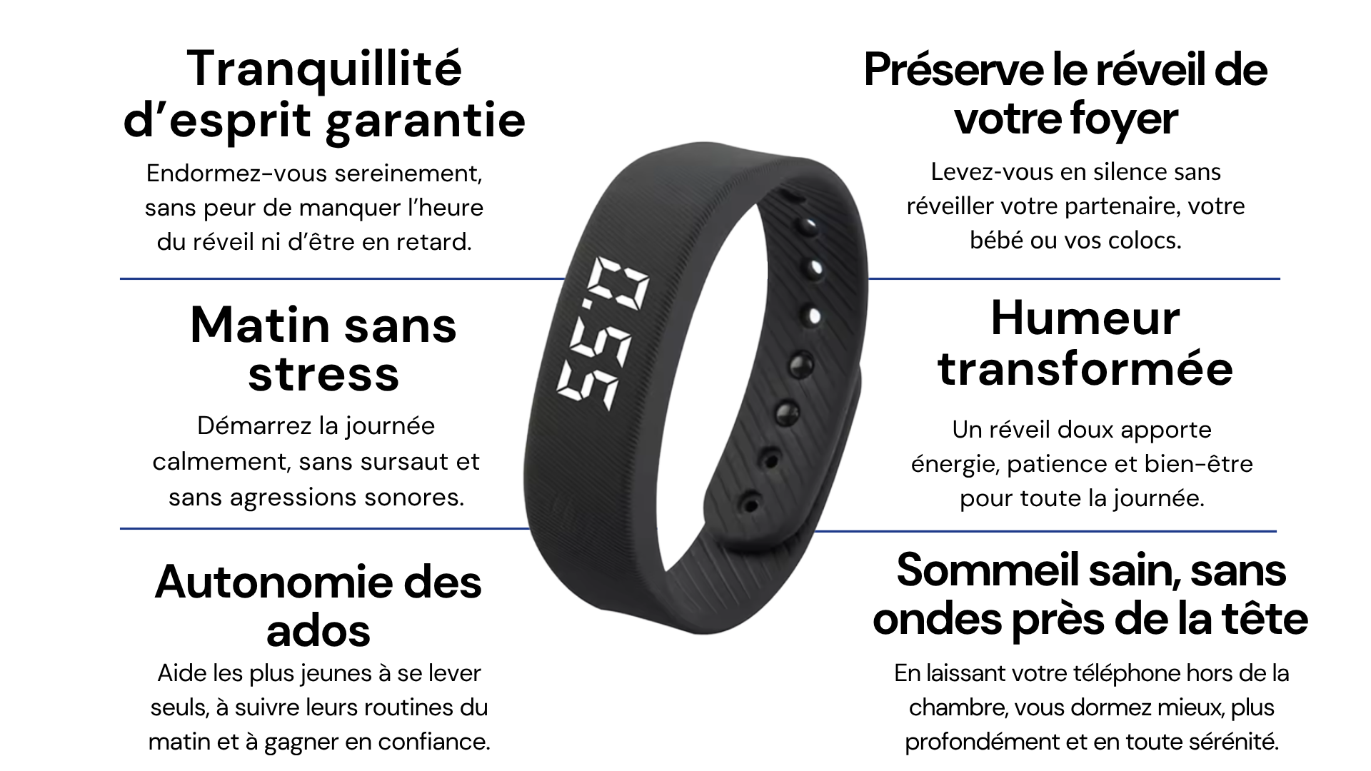" Ce bracelet est une solution fantastique pour tous ceux qui ne se réveillent pas avec leur réveil. La vibration est un excellent moyen de réveiller le corps en douceur." " Ce bracelet est une solution fantastique pour tous ceux qui ne se réveillent pas avec leur réveil. La vibration est un excellent moyen de réveiller le corps en douceur." " Ce bracelet est une solution fantastique pour tous ceux qui ne se réveillent pas avec leur réveil. La vibration est un excellent moyen de réveiller le corps en douceur."